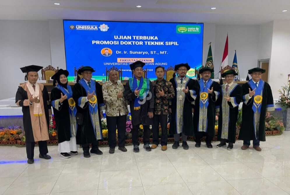 Pengusaha muda, konsultan, sekaligus dosen Universitas Wiralodra Indramayu, Ir. Sunaryo, S.T., M.T., yang akrab disapa Bang Joy, resmi meraih gelar doktor setelah sukses mempertahankan disertasinya dalam sidang terbuka Program Doktor Teknik Sipil pada Jumat (29/8/2025) di Fakultas Teknik Sipil Universitas Islam Sultan Agung (Unissula) Semarang.